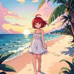 (highres),(best quality,masterpiece,very detailed,Ultra HD:1.2),illustration,wallpaper,CG,reality ray tracing,panorama,(from above:1.2),cinematic angle,medium shot,(beautiful detailed girl),clear focus,1girl,solo,detailed face,girl focus,young,solo,full body,smile,(red hair),ahoge, short hair,white short sundress,Bare feet,outdoors,(sea:1.2),(beach:1.2),(horizon),(sunset),(the breeze blew),coconut tree,(twilight:1.3),(dim:1.15),beautiful landscape,(reality ray tracing),(intense shadows),(dappled sunlight),strong rim light,