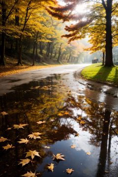 masterpiece,best quality,rain style,sunlight,light,puddle,beautiful lighting,blowing,reflection,autumn leaves,maple leaf,red particles,depth of field,forest,