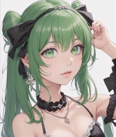 1girl, solo, green eyes, hair over one eye, choker, green hair, long hair, upper body, parted lips, looking at viewer, hair ornament, cropped torso, ponytail, bow, detached sleeves, breasts, bangs, asymmetrical bangs, tiara, vest, bare shoulders, halterneck, black choker, jewelry