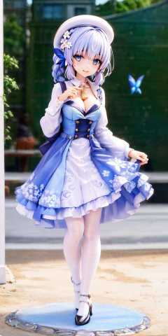 full body,(Realistic painting style:1.1), (faux traditional media:1.0), masterpiece, best quality, bokeh, depth of field, looking to the side, kamisato ayaka (springbloom missive), kamisato ayaka, official alternate hairstyle, official alternate costume, blunt bangs, butterfly hair ornament, hair flower, blue dress, 1girl, butterfly, grey eyes, flower, hair ornament, light blue hair, outdoors, solo, hat, sky, blue nails, cloud, bangs, long sleeves, holding, looking at viewer, blue butterfly, blurry, braid, dress, day, blurry foreground, blue sky, breasts, medium breasts, cloudy sky, blush, index finger raised, blue flower, smile, closed mouth, finger to mouth <lora:kamisatoAyakaSpringbloom_v10:0.9>