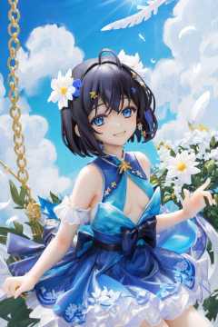 Seele,seele,detailed,masterpiece, best quality,1girl, solo, smile, bangs,hair ornament, hair flower,, blue eyes, short hair,, bare shoulders, blue hair, hair between eyes, white flower, blue flower,black hair,1girl {on a swing} ,{smile} and half-closed eyes,morning with bright colorful sunlights and clouded sun in the detailed blue sky,glowing white {feathers},small_breasts, floating_hair,halter dress,leaves,nature,{bloom},bishoujo,