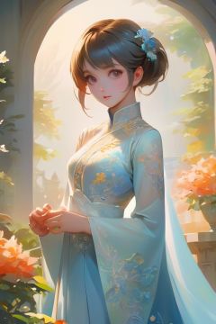 anime artwork Chinese Ancient Costume Girl, Lace wedding dress, Standing with hands on hips, cute, confident expression, Watercolor Painting, Amidst a realm of whimsical enchantment, a secret garden reveals, its intricate blossoms captivating the imagination, sunrise/sunset, graphic light, Fog, Cubist, 1girl, light slate blue . anime style, key visual, vibrant, studio anime,  highly detailed
