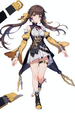 (sushangxt:1.2), (twintails:1.1), yellow sleeves,bangs, black footwear, boots, yellow hair ribbon,
