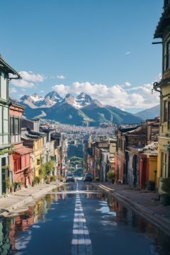 Ea narrow street with a yellow building and a green building on the other side of the street and a mountain in the distance, scenery, city, building, tree, sky, road, street,best quality,masterpiece ,