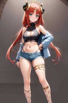 masterpiece, best quality,  <lora:nilou:1>,1girl, solo, nilou (genshin impact), horns, navel, long hair, red hair, full body, breasts, stomach, crop top, shorts, looking at viewer, gold footwear, simple background, high heels, alternate costume, shirt, panty straps, blue eyes, bangs, twintails, thighs, off shoulder, sleeveless shirt, short shorts, long sleeves, panties, standing, hand on hip, bare shoulders, highleg, open clothes, bare legs, black shirt, denim shorts, sleeveless, underwear, highleg panties, denim, closed mouth, legs, blue shorts, hand up, clothing cutout, thighlet, midriff, yellow footwear, medium breasts, parted bangs, micro shorts, smile, thigh strap, jacket, black panties, jewelry, grey background, string panties, low twintails, blush, very long hair, small breasts, nail polish, fake horns, open jacket, contemporary, cutoffs, skindentation, gladiator sandals, sidelocks, grey jacket, v, halterneck, cleavage cutout, turtleneck, casual, white shirt, thong