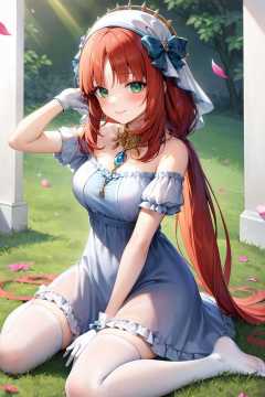 masterpiece, best quality, <lora:nilou:1>,1girl, solo, long hair, thighhighs, nilou (genshin impact), gloves, smile, sitting, red hair, dress, white gloves, white thighhighs, flower, frills, bow, blush, bangs, short sleeves, very long hair, looking at viewer, puffy sleeves, blue dress, twintails, full body, blue bow, no shoes, puffy short sleeves, frilled hairband, hairband, wariza, green eyes, alternate costume, blue flower, low twintails, hand up, bare shoulders, parted bangs, frilled dress, petals, closed mouth, grass, jewelry, white background, off shoulder, hair bow, breasts, aqua eyes, thighs, off-shoulder dress, necklace, detached sleeves, falling petals