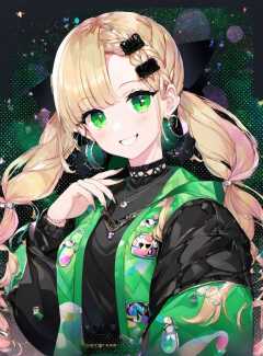 1girl, solo, jewelry, ring, looking at viewer, blonde hair, black nails, green eyes, twintails, blush, jacket, braid, hair ornament, smile, nail polish, earrings, upper body, choker, multicolored hair, black jacket, bangs, shirt
