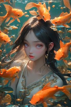 High detailed, High precision, Hyper quality, UHD,16k, Rich details, rich elements, guofeng, illustration,1girl, beautiful,Surrounded by goldfish, surrounded by goldfish, lotus, lotus leaf, pearlygates,bj_Devil_angel