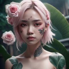 1girl,(Banana leaf:1.3),(white rose tattoo:1.3),silk,(in smoke:1.1),(upper body:1.2),((nipples:0.55)),(1 Chinese patterns in the middle of the girl's forehead),epic cinematic, soft nature lights, rim light, absurd, amazing, funny, itricate, hyper detailed, ultra realistic, soft colors,pink flowers, , ,(sad,disappointed,crying,frown,tears:1.1),