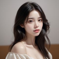 Best quality, masterpiece, ultra high res, (photorealistic:1.4), raw photo,1girl, solo, realistic, lips, black hair, looking at viewer, black eyes, teeth, long hair, hair over one eye, parted lips, nose, close-up, brown hair, simple background, brown eyes, black dress, off shoulder