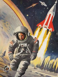 ussrart,satella,rocket,cosmonaut,outer space,<lora:ussrart-000008:1>,