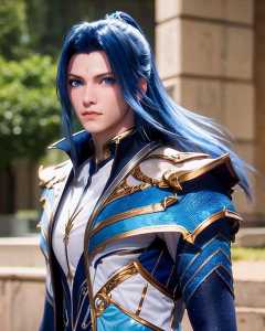 1boy, armor, blue eyes, blue hair, depth of field, long hair, looking at viewer,upper body,