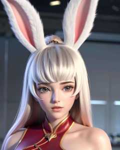 a woman with white hair and a bunny ears on her head, wearing a red top and a white rabbit ears on her head, (1girl:0.992), (animal ears:0.984), (bangs:0.785), (bare shoulders:0.578), (blurry:0.994), (blurry background:0.975), (brown eyes:0.513), (depth of field:0.959), (lips:0.848), (long hair:0.846), (looking at viewer:0.833), (mole under eye:0.570), (ponytail:0.662), (rabbit ears:0.796), (realistic:0.599), (solo:0.979), (upper body:0.759), (white hair:0.666)