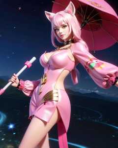 a woman in a pink outfit holding a pink umbrella and a pink cat costume on her head and a pink cat costume on her arm, (1girl:0.976), (animal ears:0.621), (aurora:0.569), (chain:1.000), (constellation:0.820), (cuffs:0.844), (holding:0.920), (long sleeves:0.605), (looking at viewer:0.654), (night:0.981), (night sky:0.988), (shooting star:0.985), (sky:0.948), (solo:0.962), (space:0.852), (sparkle:0.897), (standing:0.656), (star \(sky\):1.000), (starry sky:0.998)