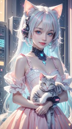 kawaiitech,pastel color,kawaii,cute colors,scifi,pink,scholar,scroll,1girl,long hair,pale skin,white hair,glowing eyes,smile,cat ears,pastel colors,pale color,hair ornament,short hair,white hair,upper body,(holding a cat),animal ear fluff,pink hair,sparkle,centered,balance,glowing love,masterpiece,best quality,official art,romantic setting,dreamy pastel color palette,whimsical details,<lora:KawaiiTech-20:1>, <lora:超写实朋克cyberpunk_v1:0.5>cyberpunk