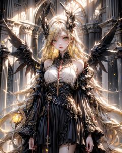 (huge white wings),(mature:1.55),(very long hair:1.5),(yellow hair:1.66),(white skin:1.55),(standing:1.55),(White knight dress:1.55),(White bishop's robe:1.65),solo,masterpiece, best quality,(4k,8K),(perpect light and shadow:1.55)(Her wings are composed of countless delicate feathers, like delicate clouds, white and soft, dancing lightly, emitting a sacred and warm light, as if able to lead people through time and space to reach the other side of heaven),(white feathers wings:1.55) ,(The blonde virgin's hair was soft and silky, with a subtle golden glow shining in the sunlight, as if it were a radiance bestowed on her by heaven Her eyes are deep and bright, and the green pupils seem to contain endless wisdom and mystery, as if they can penetrate the heart and guide lost souls Her skin is as white as snow, soft and smooth, emitting a fresh breath, like a delicate and dripping flower, which is irresistible Her noble and graceful figure, like an angel descending from heaven, evokes awe and admiration),Western architecture,cinematic lighting,Fantasy style,beautiful detailed face,detailed cloth,cowboy shot,girl, solo, wings, belt,dress,cross earrings,breastplate,bangs,indoors,jewelry, cross hairclip, gauntlets, window, day, sunlight, cross, shiny, aulds, pauldrons, gold long hair, light green eyes,yellow hair, hair ornament, closed mouth, dutch angle,shiny hair, feathered wings,crucifix,god,church,beautiful and delicate eye,side braid,giant angel wings,[[angel wings|feathered wings|glowing wings]magic circle],hair ornament,[[feathered wings[rainbow wings|transparent wings][glass] wings]magic circle],runes [ring|circle],flattened magic circle,cross_laced_footwear, petals,reflection light,(Gothic architecture), (Shoulder armor is like a golden phoenix),(There is a black and white cross on the breastplate),(Golden feathers float in the air),(In the center of the church, there is a huge cross hanging high Its beams and vertical columns are made of solid wood, and the surface is coated with a layer of sparkling metal Under the illumination of the light, this cross emits a sacred light that makes people feel awe and piety),(The protective hand is engraved with divine patterns),(out-of-frame censoring),