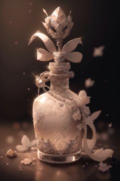 no human,bug, butterfly, white flower, no humans, white rose, flower, sparkle, rose, blurry, light particles, still life, glint, reflection, bottle, white butterfly, depth of field