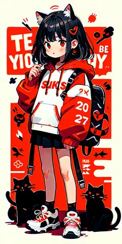 1girl, red eyes, red background, hood, backpack, cat, red hoodie, drawstring, black hair, shoes, hood down, hoodie, long sleeves, solo, bag, holding, hair ornament, english text, socks, earrings, white footwear, bangs, looking at viewer, jewelry, sneakers, phone, standing, blush, full body, skirt, medium hair, black socks, hairclip, red theme, speech bubble, holding phone, closed mouth, cellphone, sleeves past wrists, animal, short hair, simple background, black skirt, romaji text,
