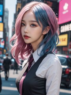 a girl is walking,best quality,looking at viewers,pink hair,blue hair,fashion style,pretty face,black suit,lmasterpiece,photorealistic,realistic,cinemagraph,realskin.milky skin,prospect,street,full body,highres,absurdres,feathers,times square,pattern,metal,skin texture,