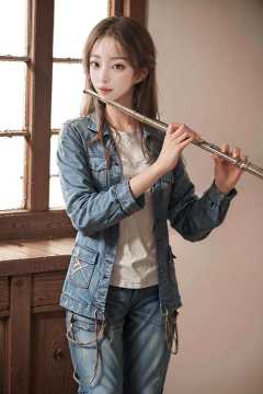 1girl, playing flute, flute, masterpiece, best quality, 8k, indoor, jeans, jacket, <lora:brass_flute:0.78>