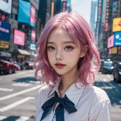 a girl is walking,best quality,looking at viewers,pink hair,blue hair,fashion style,pretty face,sailor collar,lmasterpiece,photorealistic,realistic,cinemagraph,realskin.milky skin,prospect,street,full body,highres,absurdres,feathers,times square,pattern,metal,skin texture,