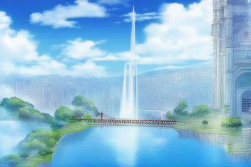 city, cloud, scenery, sky, cityscape, cloudy_sky, building, day, blue_sky, bridge, tower, tree, waterfall, water, skyscraper, outdoors, fantasy, no_humans, railing, architecture, rooftop, mountain, fountain, gate, clock, ocean, skyline