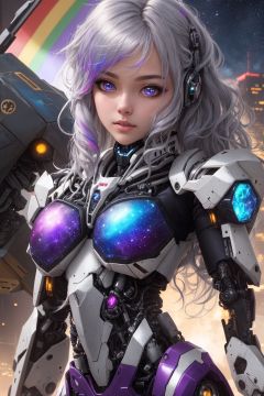best quality,extremely detailed,detailed background,anime,a young beautiful girl,very long rainbow hair,(close shot),extremely detailed face,an extremely delicate and beautiful mecha girl,extremely detailed eyes,(floating silver grey hair),(Iridescence and rainbow hair),(gradient color mecha clothes),(black and blue and purple mecha clothes),Iridescence and rainbow mecha,(bodysuit:0.8),(cyberpunk),((scifi)),((sci-fi)),night,space,horizon,beautiful detailed starry sky,top of the city,(dynamic posture),solo focus,close up,depth of field,bokeh,cinematic lighting,atmospheric lighting,science fiction,close up shot,close-up photo,(close to the camera),close to the lens,(close to the viewer)