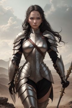 A fierce warrior woman stands tall in a battlefield, wielding a large and ornate shield with one hand, a long spear with the other. She wears a sturdy suit of armor that covers her entire body, and her long hair is braided back tightly. Scars mark her face, evidence of her many battles and fierce determination. She stares ahead with a stern and focused expression, ready to defend herself and her allies against any enemy that dares to challenge her. The battlefield is a desolate and barren wasteland, with no sign of life other than the warriors engaged in battle.