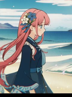 masterpiece, best quality,extremely detailed CG unity 8k wallpaper,Depth of field,cinematic lighting,backlighting, cel shading,anime screencap, long hair,beautiful detailed eyes,1girl,finely detail,(upper body:1.2),pink hair,(blue streaked hair:1.25),blue sky with cloud,sea,(flower near sea:1.5),GI.JP, seductive smile, random pose,solo,looking at viewer,ribbon, standing on beach,near water,blush,blunt bangs, blue water
