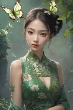 chinese girl,Masterpiece, ultra high resolution, artwork, magnificent contrast, fantasy, fantasy, atmosphere, girl, exquisite details, clear patterns, clear visuals, clarity, sophistication, realism, green themes, flying butterflies