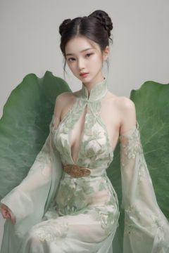 Ancient Chinese Beauty, wearing Hanfu, standing by one enormous lotus leave with intricate patterns, median transparent/translucent lotus leave, soft glow, in the style of Albert Watson, minimalism, light emerald and white, simple white background, surrealist, feminine sensibilities