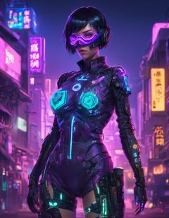 cyberpunk style, 1girl, solo, glowing, neon trim, short hair, medium breasts, breasts, looking at viewer, black hair, glowing eyes, night, mask, science fiction, cyberpunk, standing, cowboy shot, sky, outdoors, arms at sides, blurry, bodysuit, purple eyes, blurry background<lora:cyberpunk_style_xl-off:0.8>