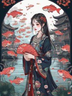 High detailed, High precision, Hyper quality, UHD,16k, Rich details, rich elements, illustration,1girl, beautiful, surrounded by Piranhas fish, sharp teeth, lotus, lotus leaf, pearlygates ,devil,horror,traditional clothes, dark blood theme, scary dress <lora:Hmongbxl-000010:0.7>