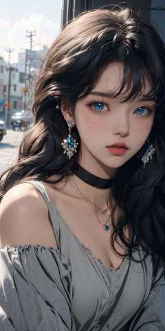 (masterpiece:1.2), best quality,PIXIV, 1girl, solo, black hair, jewelry, long hair, earrings, blue eyes, choker, looking at viewer, parted lips, blush, necklace, upper body, black choker, bangs <lora:s_20230805204449:1:OUTD>