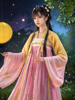 (masterpiece,best quality:1.5), uhd image, glassy translucence, vibrant illustrations, ultra realistic, long hair, straight hair, portrait, mysterious forest, firefly, bokeh, mysterious, night, sky, cloud, eyes detail, beautiful eyes, light in eyes,hanfu, tang style outfits, pink upper shan, multicolour chest pleated skirt, yellow waistband, <lora:tangStyle_sdxl_autodl_v36-000030:0.55>