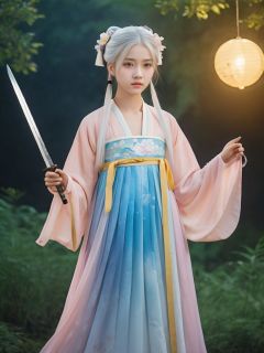 (masterpiece,best quality:1.5), , asian girl with white hair,12 years old, straight hair, holding a sword, in the style of dark azure and light azure, mixes realistic and fantastical elements, vibrant manga, uhd image, glassy translucence, vibrant illustrations, ultra realistic, long hair, straight hair, portrait, mysterious forest, firefly, bokeh, mysterious, night, sky, cloud, eyes detail, beautiful eyes, light in eyes,hanfu, tang style outfits, pink upper shan, multicolour chest pleated skirt, yellow waistband, <lora:hanfuTang_v41_R_SDXL:0.6>