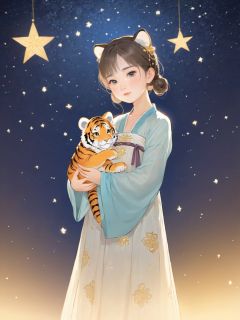star,starlight, forest, 1girl holding tiger baby, looking at viewer, tiger baby ears, she wearing hanfu, surrounded by shining stars, animation illustration,<lora:hanfuTang_v41_R_SDXL:0.55>,