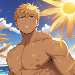 A strong man sweating profusely in the sun on the beach, short hair and beard, wheat-colored skin shining in the sun,1boy,topless,dark_skin,blue_eyes,Anime style,bara,wet body,