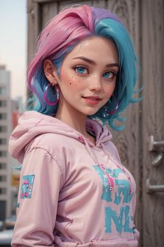 smile,parted_lips,multicolored_hair,piercing,solo,hood_down,blue_hair,blue_eyes,jewelry,long_hair,pink_hair,realistic,hoodie,looking_at_viewer,1girl,earrings,mole,hood