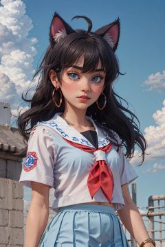 web_address,solo,jewelry,cloud,day,serafuku,patreon_username,sky,animal_ears,blue_eyes,long_hair,earrings,cloudy_sky,ahoge,school_uniform,outdoors,1girl,cat_ears,neckerchief,skirt,blue_sky,artist_name,watermark