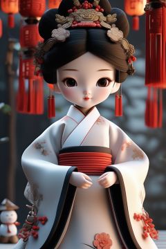 The doll is wearing a traditional chinese costume, in the style of unreal engine 5, cartoon mis - en - scene, 32k uhd, ivory, minimalistic japanese, hyper - realistic sculptures