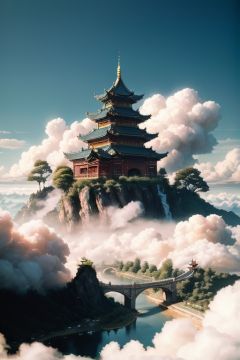 8k high quality, detailed, colorful analog photo, masterpiece, photorealistic, vibrant color film, masterclass, heavy (film grain), Fujicolor 400, Nikon F401,DUNGHUANG,DUNGHUANG BACKGROUND,on the sky,on the clouds,Fairyland, surrounded by clouds and smoke, oriental palace bridge, monster