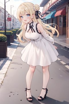 hair ribbon,buns, blonde hair, blue eyes, large breasts,long hair, bangs,looking at viewer, long sleeves, blush, stray hair,smile, open mouth, wink,Simple backgroundchina_dress, standing,full_body,arms behind back, leaning forward,bare legs,high heels