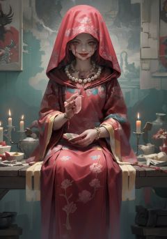 (masterpiece, top quality, best quality),horror (theme),solo,sitting,beads,veil,holding,jewelry,looking at viewer,necklace,candle,1girl,indoors,long sleeves,blood,floral print,hood up,smile,dark,dress,horror (theme),