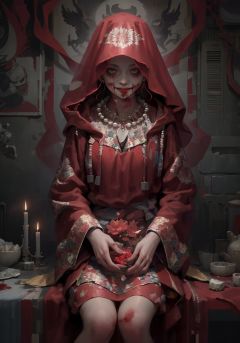 (masterpiece, top quality, best quality),horror (theme),solo,sitting,beads,veil,holding,jewelry,looking at viewer,necklace,candle,1girl,indoors,long sleeves,blood,floral print,hood up,smile,dark,dress,horror (theme),