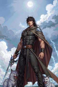 1boy, male focus, sword, weapon, solo, cape, wolf, tattoo, long hair, black hair, lightning, raining, moon,masterpiece, best quality, 8k