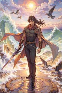 1boy, male focus, sword, weapon, solo, cape, bird, traditional media, tattoo, sunset, brown hair, black hair, scarf, long hair, water, wave,masterpiece, best quality, 8k