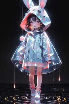 <lora:zycpp_20230808095133-000020:0.8>, zycpp,1 girl,solo,standing, a raincoat with a hat,a hat in the shape of a rabbit,translucency and luminous raincoat,blush, full body,