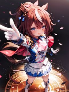masterpiece, best quality, tokai teio \(umamusume\), from above, brown hair,pointing up, looking up, smile, open mouth, confetti, hair ribbon, pink ribbon, single epaulette, pink ascot, red capelet, long sleeves, asymmetrical gloves, mismatched gloves, white glove, blue glove, multicolored clothes, two-tone jacket, white jacket, blue jacket, shirt, buttons, double-breasted, white skirt, pleated skirt, two-tone skirt, miniskirt, white footwear, knee boots, <lyco:帝王tokai_teio_loha-000010:0.7>
