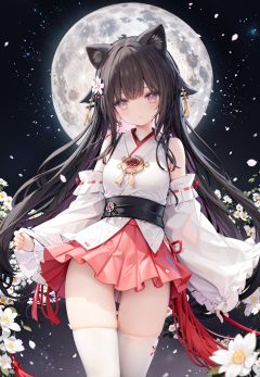 1girl, long hair, solo, thighhighs, black hair, hair ornament, moon, japanese clothes, skirt, detached sleeves, white thighhighs, miko, hakama short skirt, hair flower, very long hair, ribbon trim, ribbon-trimmed legwear, full moon, hakama skirt, hakama, brown eyes, outdoors, night, standing, looking at viewer, flower, hand on hip, tree, red skirt, sky, wide sleeves, smile, ribbon-trimmed sleeves, star (sky), fence, blush, bangs, zettai ryouiki, bare shoulders, night sky, red eyes, nontraditional miko, red hakama, thighs, closed mouth